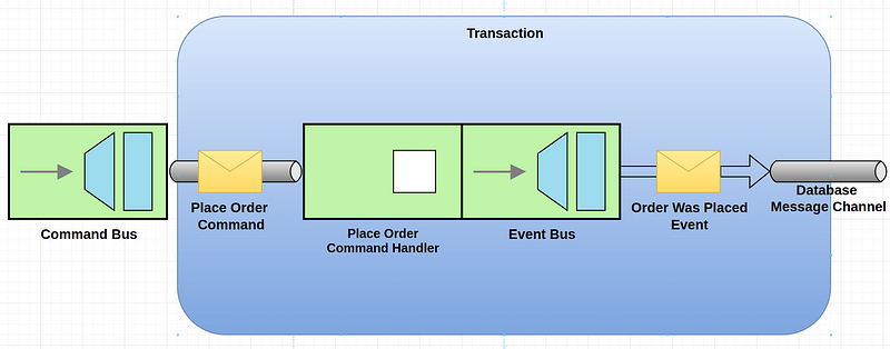 By default, Ecotone wraps the Command Handlers and all subsequent actions in a transaction. This means that if we use Database based Message Channel, the Messages will be committed along with the Order.