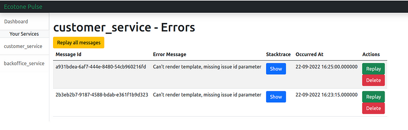 In order to control error messages for all your services from single place, Ecotone Pulse was created. It allows your to review, replay and delete error messages using single application.